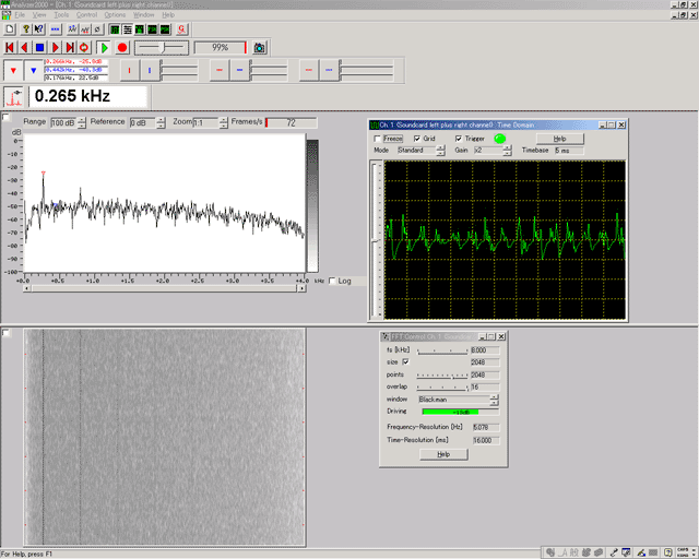 このソフトを使うと、FFT機能により、スペクトラムの中に、ノイズの中のわずかな信号の見つける事が出来ます。